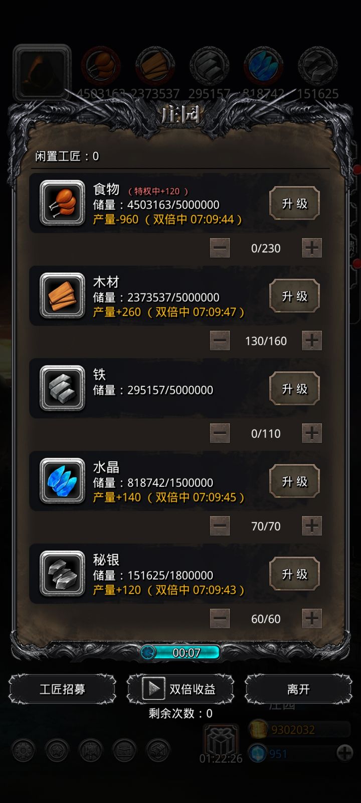 所以,双倍生产时,生产优先级为秘银>水晶>铁>木材>食物,选错了差距是非常大的(举例,一个工人生产食物双倍是2食物,生产秘银则是2秘银-9食物=11食物,生产秘银收益是生产食物收益的5.5倍!)