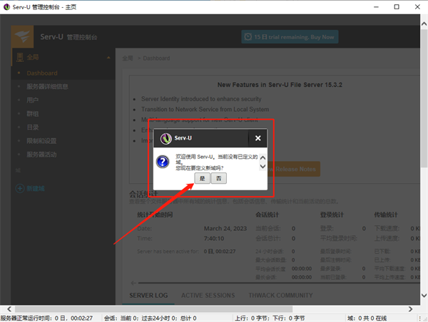 进入安装程序后,只要一路点击下一步,很快就能安装完成。在安装完成首次运行Serv-U时,会显示“当前已定义的域,要先在定义新域吗”,直接选择是。