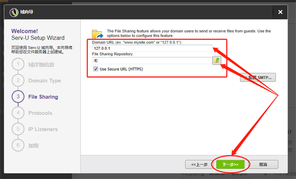 第三步Serv-U会要求我们填入domain URL(域名网址),这里我们根据其范例填入本地地址即可(127.0.0.1);第二行是file sharing repository(共享文件存储库),小鸠选择整个E盘均进行共享。如果需要设置为共享某个文件夹的,则可以点击栏位右侧的“文件夹”图标进行选择