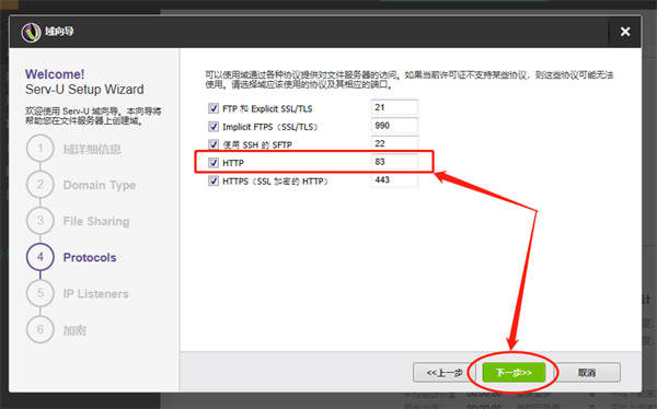 第四步是对Serv-U的输出端口进行设置。同样的,如果没有特殊需求、或系统默认的80端口没有被占用,则可以不用修改设置。但小鸠Windows系统的80端口已经被占用,因此需要将80端口修改,这个例子中改为83。