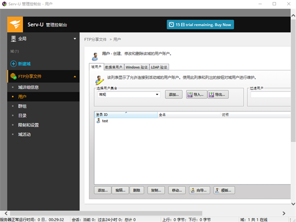 完成以上步骤后,我们就完成了Serv-U的共享区域设置,接下来就是添加域用户步骤。这里我们只要跟着软件提示进行操作即可。需要注意的是,在域用户设置的最后一步,会涉及该用户访问共享文件的权限,如果不想该用户修改共享文件,则要选择“只读访问”,反之则选择“完全访问”。