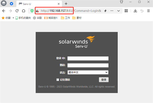 由于我们之前设置的Serv-U地址为本地地址(127.0.0.1),因此这里我们需要在浏览器中输入本地电脑的IP地址加端口号,具体格式为http://192.168.X.X:之前设置的端口号。在这个例子中,Serv-U访问地址为(http://192.168.157.1:83)。