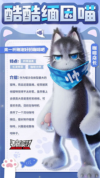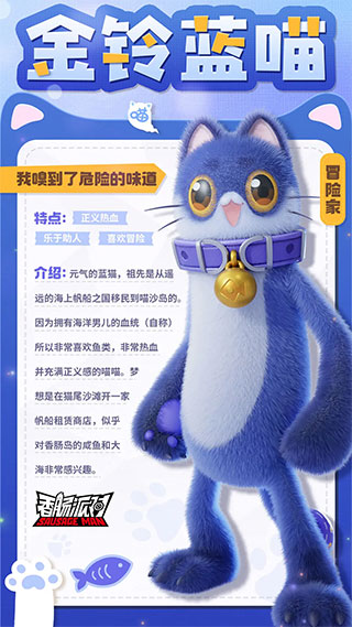 元气又热血的他喜欢行侠仗义,遇到路见不平之事定会出手相助,金铃蓝喵还会救援海上遇难的猫猫,是一位深受喜爱的猫猫英雄。