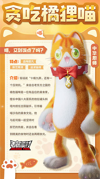 作为一名厨师,胖胖的贪吃橘狸喵对美食有着自己的独特追求,他用精湛的厨艺制作的中国美食引领了喵沙岛的“新食尚”。