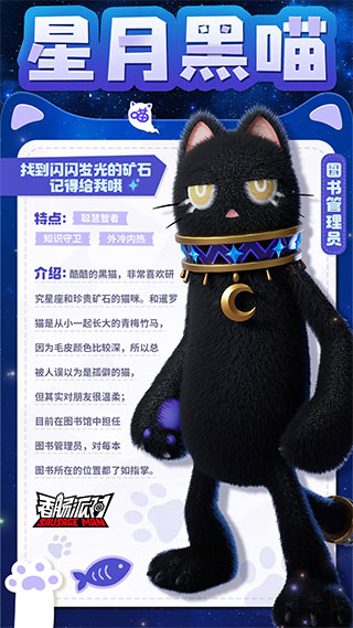 欣赏矿石和望向星空,这便是星月黑猫最爱的生活日常。酷酷的外表下,隐藏着对朋友的关心和温柔 。她经常为青梅竹马暹罗猫的憨憨性格而操心,还会用自己的知识为遇到难题的猫猫们出谋划策。另外还擅长在黑暗中隐藏自己,为图书馆的客人们送上惊喜。