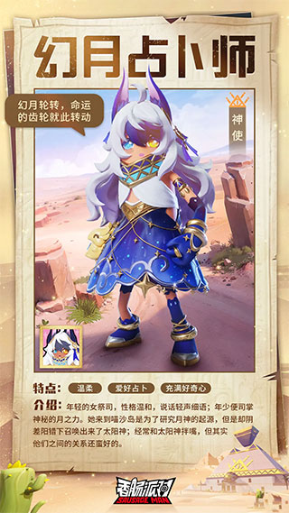 幻月占卜师是喵沙岛的神秘祭司,年纪轻轻的她就拥有着月神之力。为了研究信仰的月神,占卜师来到了喵沙岛,在机缘巧合下召唤出了喵沙岛的守护神明。