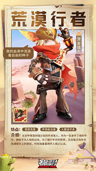 那一天,他从天而降,从此就成为了喵沙岛上的一位牛仔,凭借着敏捷的身手和精准的枪法,很快他就成为了坏人们惧怕的荒漠行者。