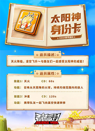 在装备「太阳神身份卡」后,肠肠就将获得太阳神的神圣力量!不仅可以召唤天火,还可以与肠友一起俯冲飞行。