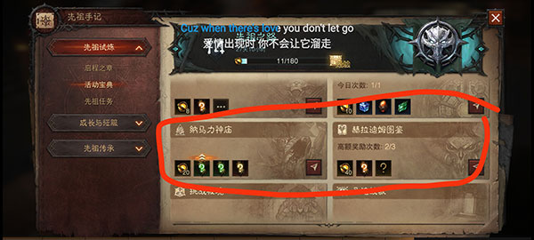只要达到一定的先祖印记,即可升级获得大量经验以及一定的奖励,这边我个人建议赫拉迪姆的图鉴每天三次一定做完,如果做完来的话就刷纳马力神庙,一次给20印记,给的装备也多。