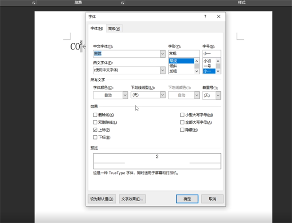 2.字体设置栏中可以看见字体的状态,选择将2设置为0的下标,这样就可以在文档中输入CO2 ,数学式中的平方符号也可以如法炮制打出。