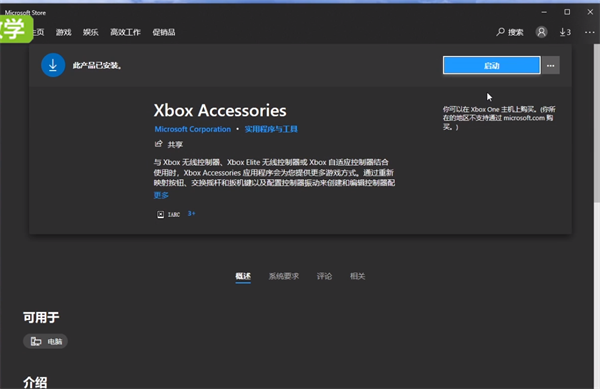 精英手柄的背键只能在win10系统的电脑和xbox上设置,所以本视频以win10系统的电脑为例来展示如何设置精英手柄背键。在win10系统中打开开始菜单栏,在开始菜单栏中点击选择【micosoft Stroe】进入微软商店,再在微软商店的顶部输入【xbox accessories】并下载该软件,这款软件是微软官方指定的精英手柄设置应用。打开该应用程序并插入精英手柄,这时程序界面会显示出所插入精英手柄的型号类型。
