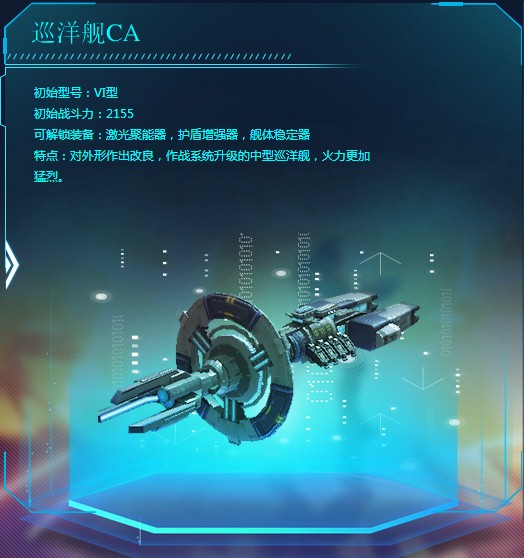 巡洋舰采用了强力的激光武器,同时有较强的防空性能。在对手的制空火力比较强劲的情况下,护卫舰就派不上用场了,多装备几艘巡洋舰往往能收获奇效。攻击间隔中等,在抗住制空火力的情况下也能打出足额输出。
