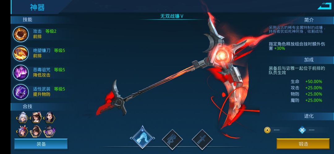 无双战镰(战镰):前排群攻,降低攻击,受伤加防。满级外观与属性预览: