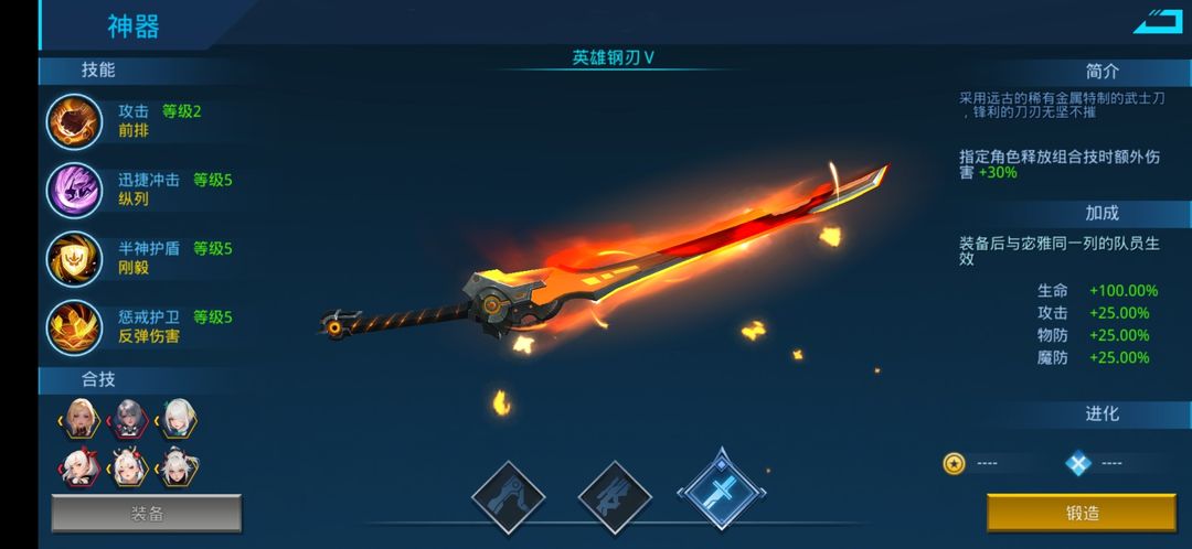 英雄钢刃(太刀):纵列攻击,全体加攻,锁血反伤。满级外观与属性预览: