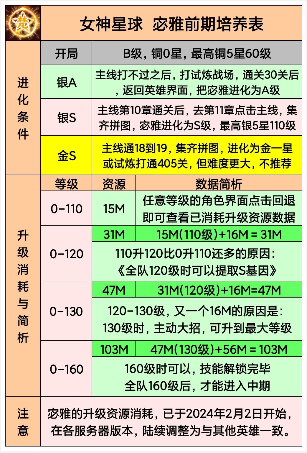 ⑥进入中期,宓雅和第七人需要进化SS,才能继续提升星阶和等级,否则卡在160,等于多准备一套进化资源。比如宓雅养到红红一星需要57个狗粮(我算的是57,有错请纠正),第七人升红红一星要78个狗粮。加上很多人喜欢均升,那就不只是单纯的这57/78个S卡的问题了……有可能,总体培养进度始终落后。