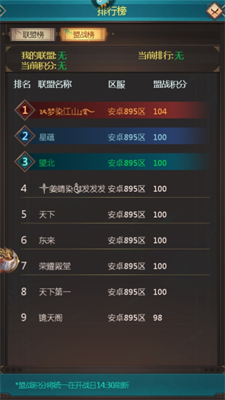 8、盟战榜单:盟战对冲榜影响最大的当然是联盟冲榜,所以每一个联盟都应该有大局观,由于每个冲榜都是按照一定的顺序来的,很好预见那个月会有联盟冲榜,所以提前应该给联盟降积分,保留厉害大臣到联盟冲榜,联盟冲榜一般是6天,会有2次盟战。这2次盟战对联盟冲榜的名次影响特别大。