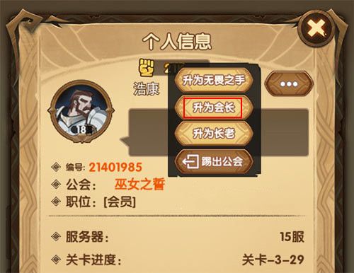 3、选择你想转让会长的成员,进入个人页面,点击名字后面的省略号,再点击【升为会长】,自己成为普通会员即可退出公会。