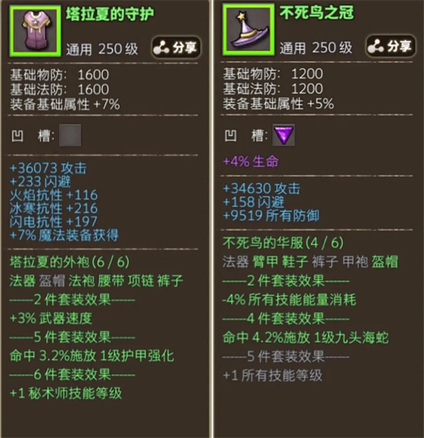 武器也可选全技能加2的装备,其他部位由于不死鸟和塔拉夏的套装空缺部位不一样,这里就不做详细的举例说明了,毕竟这游戏的有趣点就在于装备跟技能的搭配上,自己多琢磨一下。