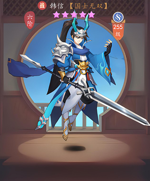 【国士无双】主动技能;对敌方单体造成260%物理伤害,该伤害无视40%防御,对自己附加【韩信点兵】。