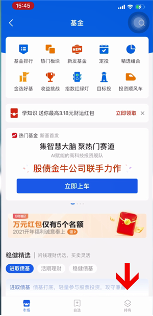 这时点击底部持有即可查看自己所购买的基金,点击需要取出的基金,