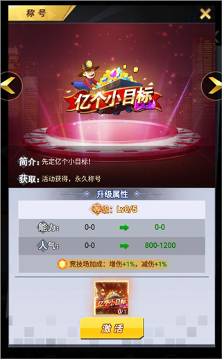 5、进入称号激活页面,可以查看称号激活的条件以及升级后的属性加成。