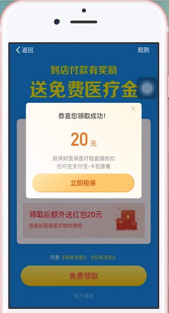支付宝的免费医疗金每天可以领取两次,只要每天用支付宝支付,不管消费多少钱,每天的前两笔,都能免费领取3到288元的住院医疗金,累计最高为2万元,可用于免费报销住院治疗费用。