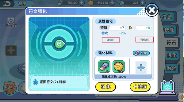 注意:四星以下符石的强化极限是强化成功9次,只有超过4星以上符石才可以强化成功到12,目前最高强化成功为12次,并且每次强化的成功率会随强化成功次数的增加而降低。为此特意提醒玩家如果没有合适的5星符石,那么4星有百分比属性的符石可以进行强化,因为4星和5星强化到后面都是12。