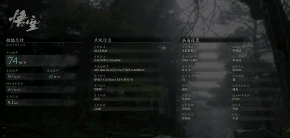 12600KF+RTX 4070 Ti(大部分选项影视级1440、超高光追、DLSS帧生成):最低帧62FPS 平均帧74FPS