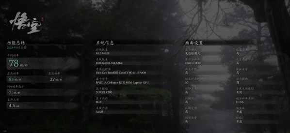13700H+RTX 4060M(高画质1440、无全景光追、DLSS帧生成):最低帧27FPS 平均帧78FPS