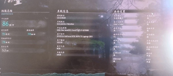 12700H+RTX 3070 Ti M(高画质 1440 无全景光追 FSR帧生成):最低帧74FPS 平均帧86FPS