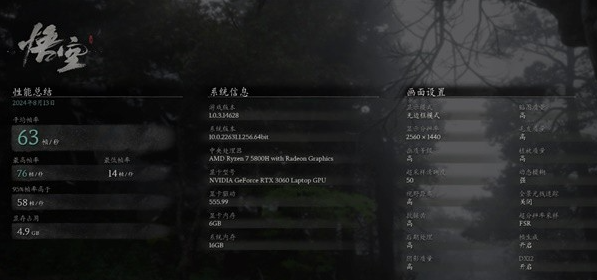 5800H+RTX 3060M(高画质 1440 无全景光追 FSR帧生成):最低帧14FPS 平均帧63FPS