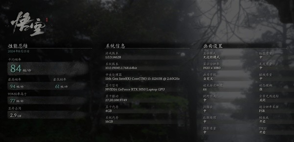 i5-11260H+RTX 3050M(中画质 1080无全景光追 FSR帧生成):最低帧61FPS 平均帧84FPS