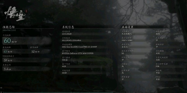 12400F+GTX 1650 S(自定义画质 1080 FSR帧生成):最低帧52FPS 平均帧60FPS