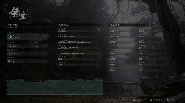 7800X3D+7900XT(影视级画质 2160 无全景光追 FSR帧生成):最低帧51FPS 平均帧90FPS
