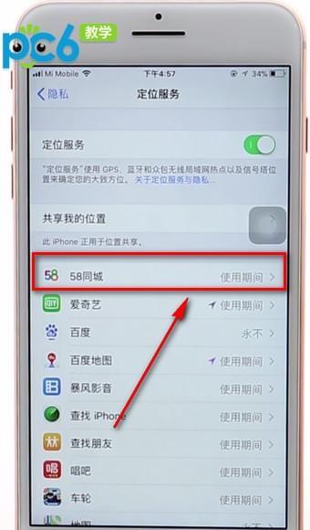 3.然后下方可以看到众多软件都在使用手机定位,如果不想将自己的位置共享到某款app中,可以在app后方设置为永不,就不用担心自己的位置隐私遭到泄露啦