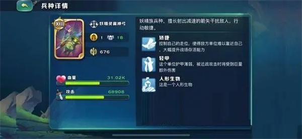 妖精唯一一个满12科技可以扩编的兵种,也是唯一一个带士气的兵种,但是不得不说这个兵种很让人失望。对被缠绕单位造成额外伤害可以和树人的缠绕配合,占位也小,但除此之外就没啥亮点了,数量少,面板低,没有弩的爆发没有金弓的持续真的是毫无亮点,打架时候连金剑都射不动更别提射蝎子和机甲,被蜘蛛吐一口或者弩手喝水就会以肉眼看不见的速度消失,可能唯一的作用就是守城吧。要知道在各种西方玄幻小说里妖精族里的精灵神射手都是很恐怖的存在,但这个兵种感觉光芒完全被另外几个兵种掩盖了,很多人都宁可用慢热的蘑菇而不用妖弓,不过幸好妖弓长得帅,妹子可能会喜欢。