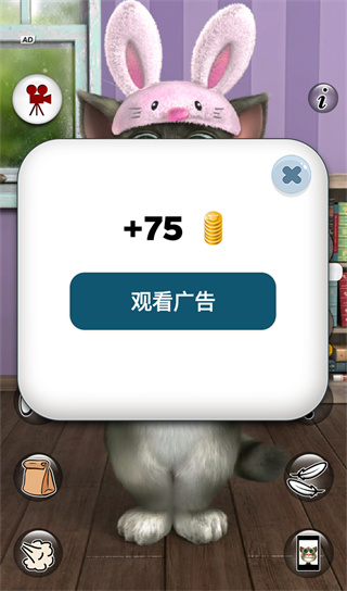 观看广告是会说话的汤姆猫2游戏中获取游戏金币的直接方式,观看短暂的15秒/30秒广告即可直接获取75金币,非常的划算!