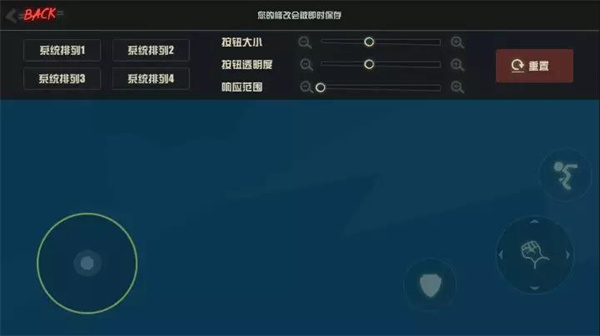 12、自定义布局中可以设置四个基本功能键的按钮大小,按钮透明度以及响应范围,系统提供4种排列方案,我们可以保存4种常用的不同排列方案,以便之后快速切换。