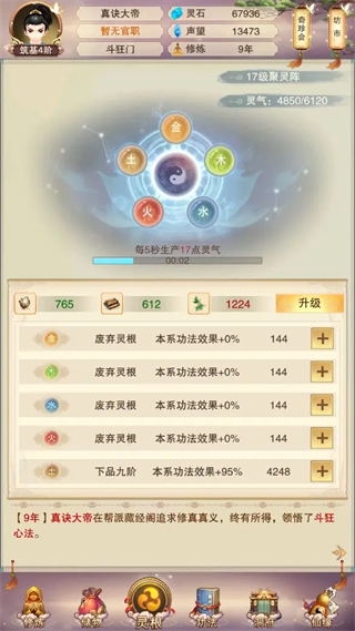 聚灵阵升到14或17级,然后升级功法和土灵根