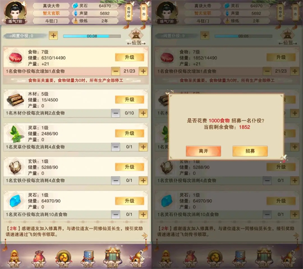 洞府界面升级食物和木材