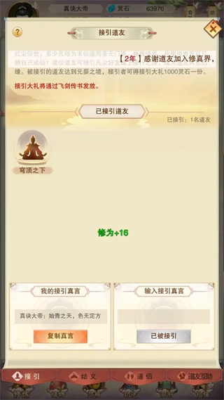 忘了说一个事,关于道友界面,被人接引可以领1000灵石,
