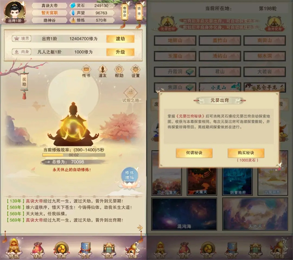 在仙缘界面的左上角点击元婴出窍,1000灵石购买秘诀
