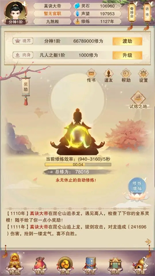 进了隐神谷就可以挂真传学炼丹了,我们零氪真诀到达分神需要很久
