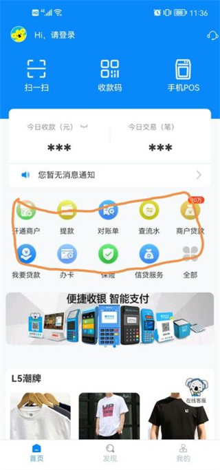 1、首先大家需要下载拉卡拉商户通,进入软件首页这里可以进行开通商户、提款、对账单等等。