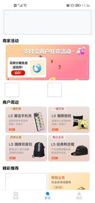 2、在软件下方发现栏里面可以看到商家的活动以及周边的商户。