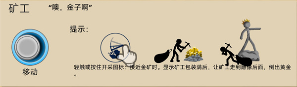 轻触或按住开采图标:接近金矿时。显示矿工包装满后,让矿工走到雕像后面,倒出黄金,完成收集。