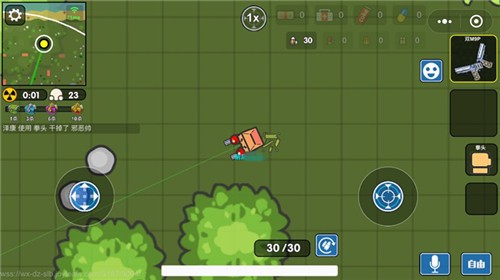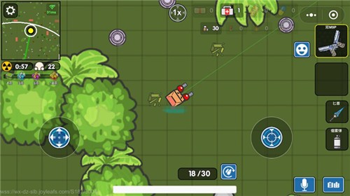 2、可以在小地图下方看到地图上的剩余人数和下一个毒环的倒计时。左摇杆控制角色的移动,右摇杆控制攻击的方向。