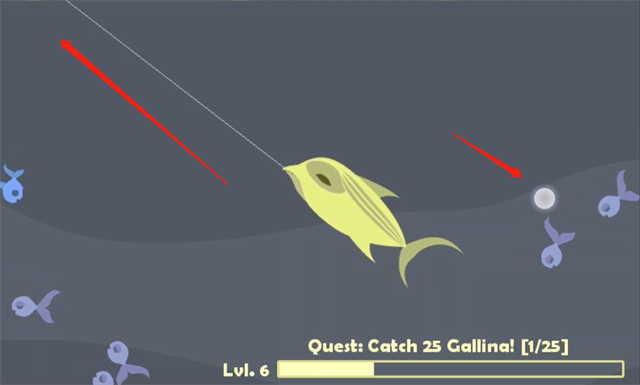 4、再通过长按屏幕来回收鱼线,钓到鱼之后就可以长按屏幕拉起来啦!
