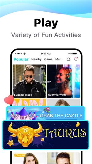 3、社交直播:全新社交体验!随时随地进行聊天互动,结识新朋友,展示颜值,展示才艺,成为焦点人物。