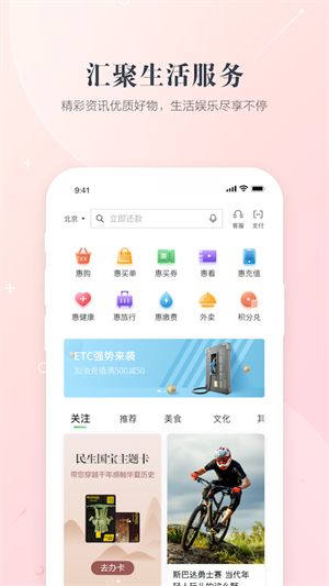 1、在线办卡:您可通过民生信用卡全民生活APP在线提交申请,海量产品,最快3秒核卡。
